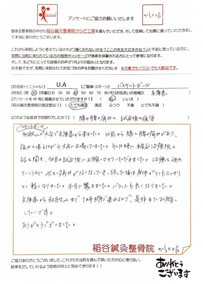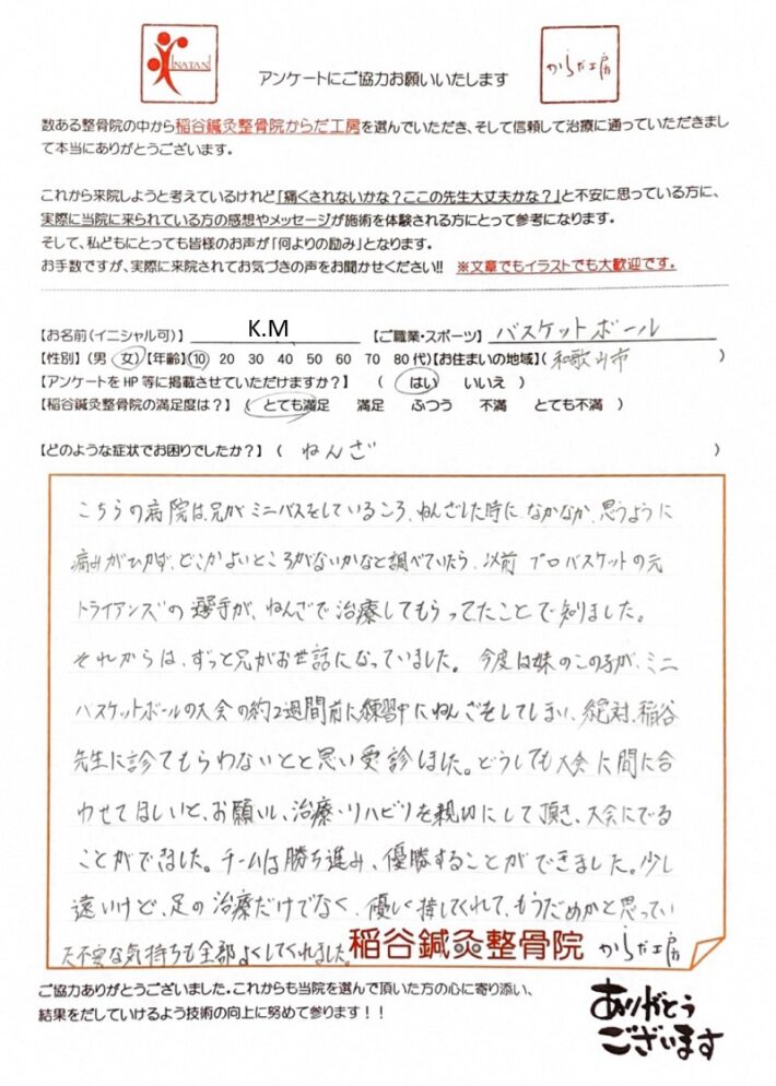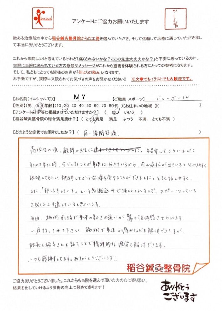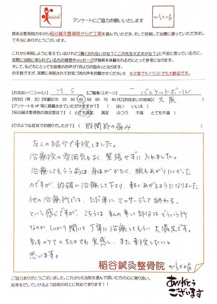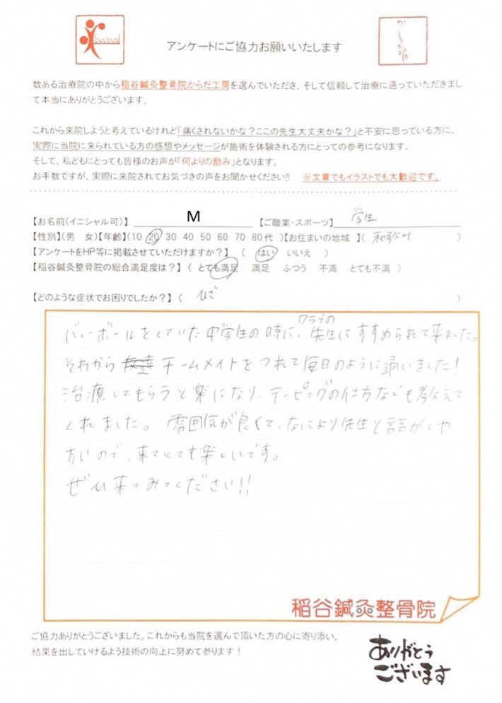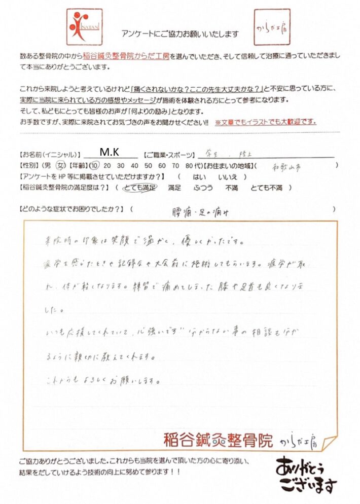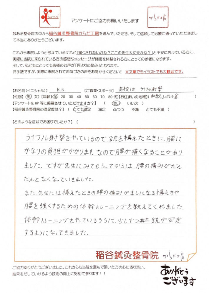 高校生の頃、顧問の先生に紹介してもらいました。初めて来た時、今どんなことが身体におきているのか今の症状が出ていると分かりやすく説明してもらい納得してから治療を受けることができました。とても話しやすく、また「部活をしている」という意識込みで接してくれるので、スポーツしている方はより適していると思います。