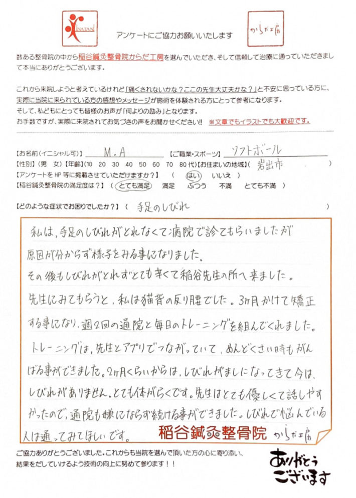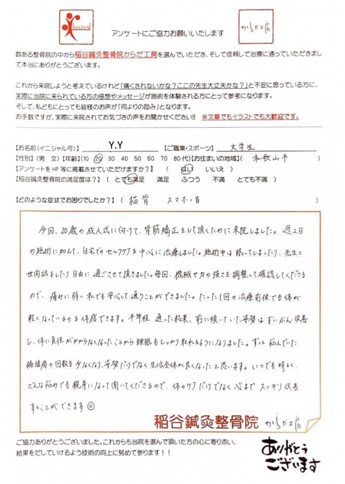 無理なく通い続けやすい環境を作ってくれる先生たち。温かい笑顔で迎えてくれる稲谷鍼灸整骨院にこれからも通いたいと思っています。