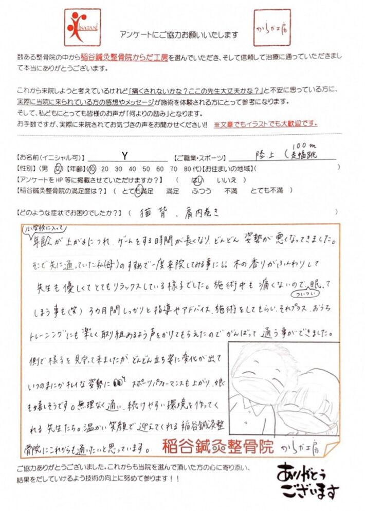 小学校に入って年齢が上がるにつれ、ゲームをする時間が長くなり、どんどん姿勢が悪くなってきました。そこで先に通っていた私(母)のすすめで一度、来院してみる事に!!
